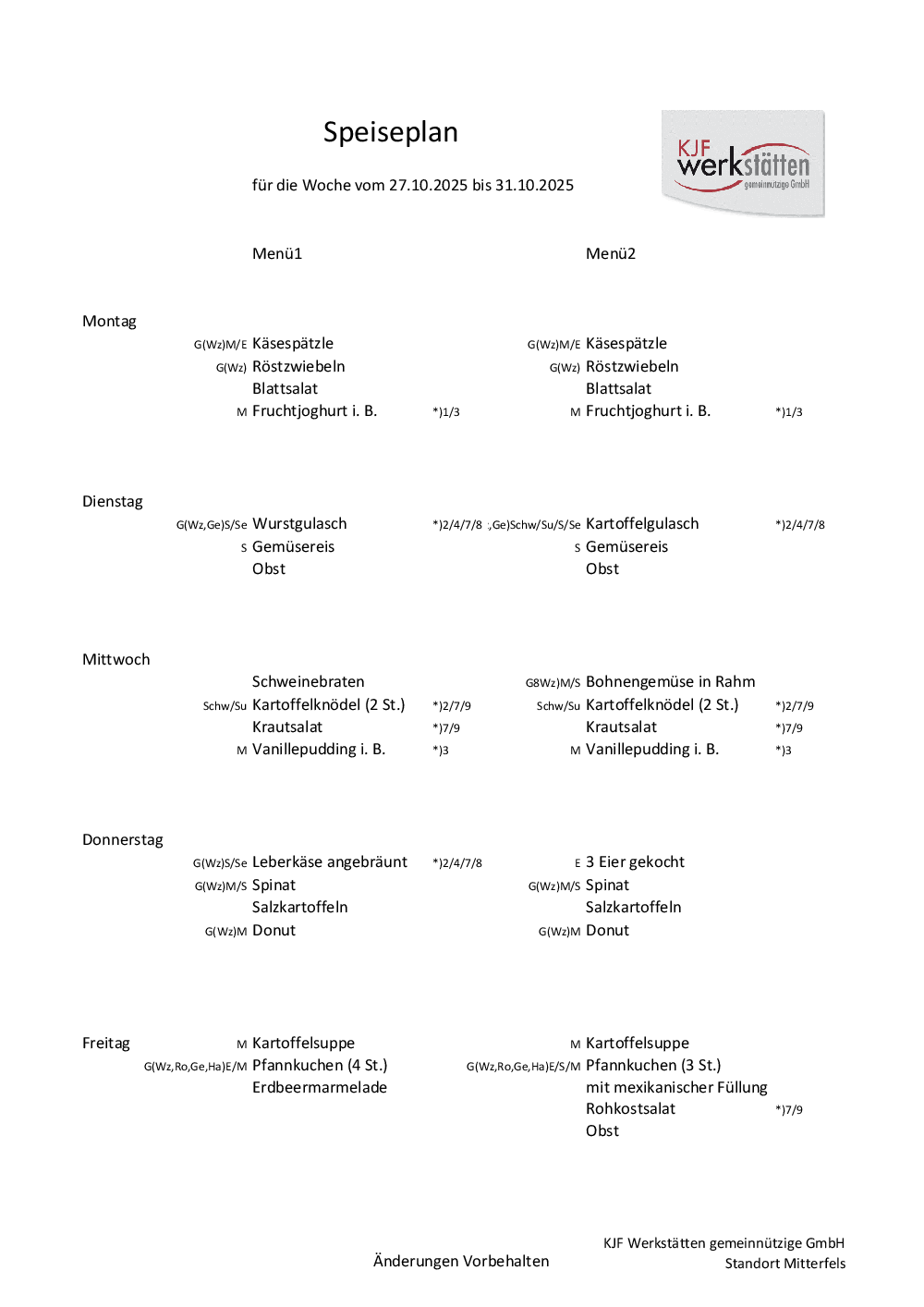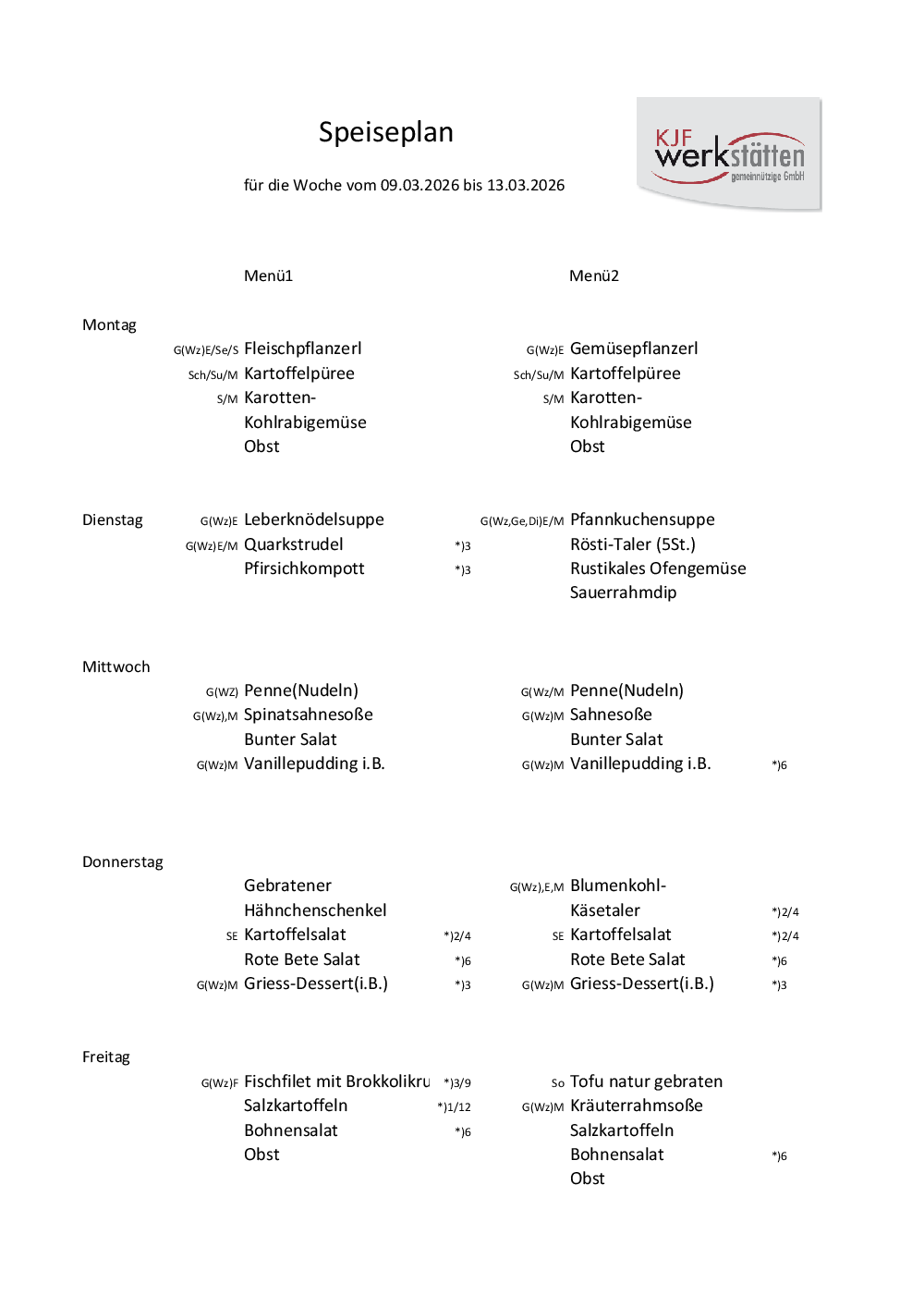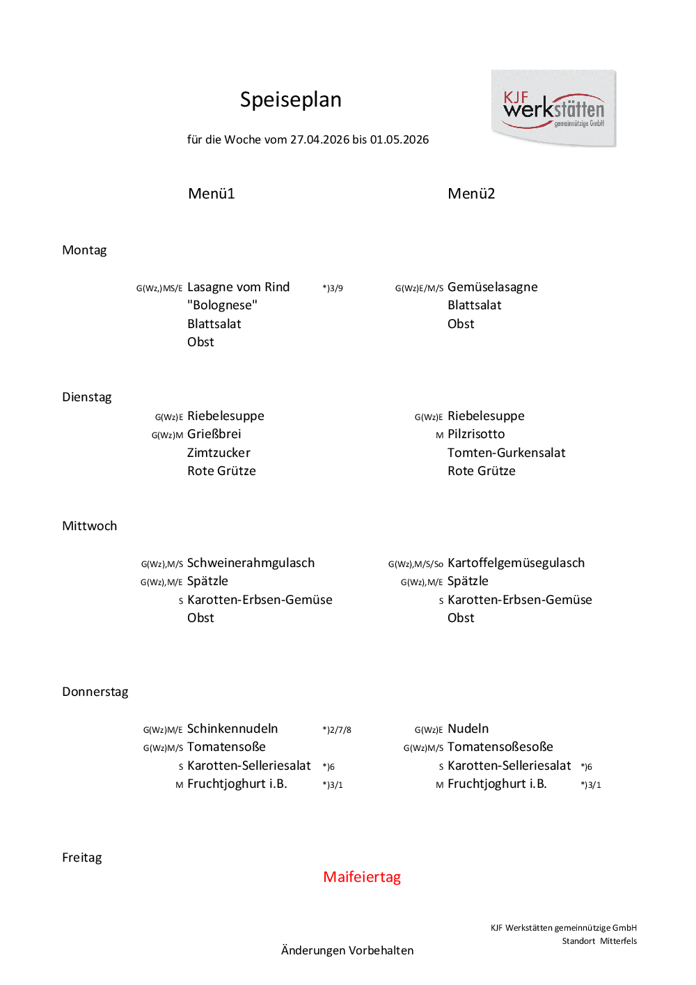 Speiseplan Kinderhaus und SVE