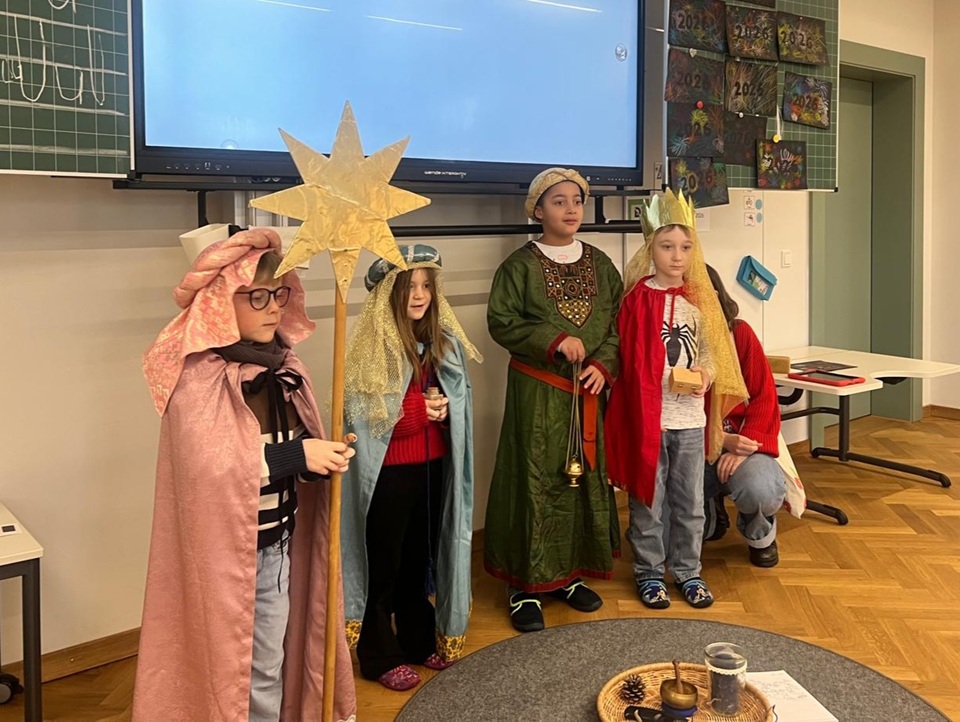 Kinder aus der Inklusionsklasse 1 waren im Bildungszentrum St. Wolfgang als Sternsinger unterwegs. Angeführt von einem Sternträger machten sie sich dabei in zwei Gruppen auf den Weg. Ausgestattet mir prächtigen Gewändern, Gold, Weihrauch und Myrrhe besuchten sie alle Klassen. Die Sternsinger erzählten den Schülerinnen und Schülern von der Freude des vergangenen Weihnachtsfestes. Sie überbrachten Neujahrswünsche und den Segen, bevor sie anschließend weiterzogen.